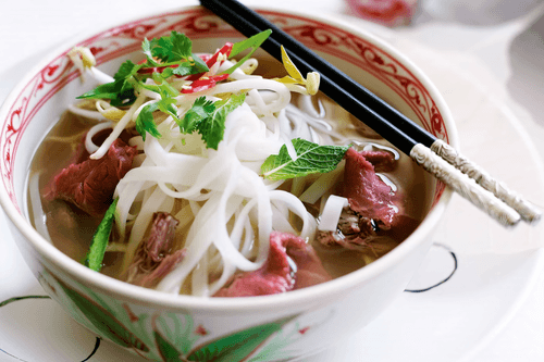 Place noodles in a soup bowl, sprinkle with chopped herbs, and add sliced beef beside it. Pour hot broth into the bowl and garnish with bean sprouts.