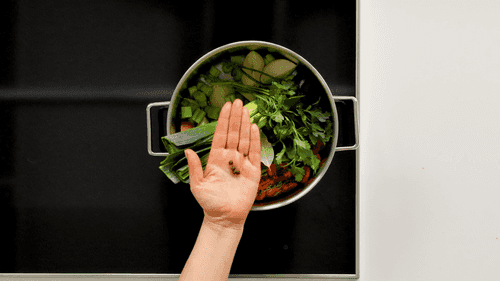 Place the prepared vegetables in a pot, add whole garlic cloves, the green part of leeks, parsley, thyme, bay leaf, black and allspice.