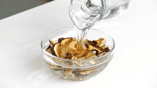 Soak dried white mushrooms in cold water for 15 minutes to remove sand. After 15 minutes, drain the water and rinse the mushrooms.