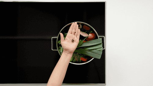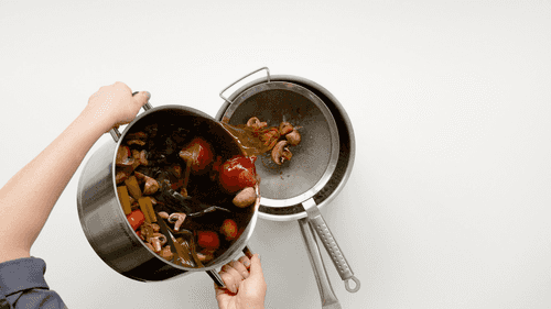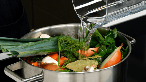 Put all prepared vegetables and mushrooms in a pot, add the green part of the leek, thyme, parsley, dill, whole garlic cloves, bay leaf, black and allspice.