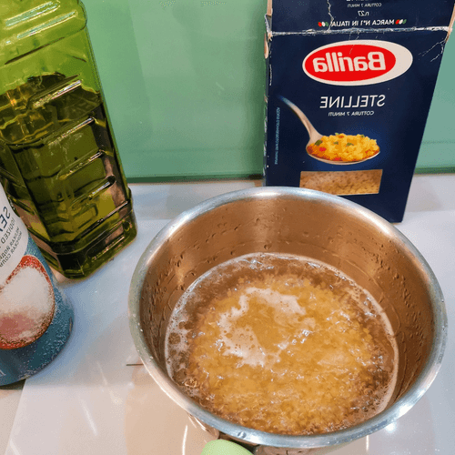 In a small pot, heat water, and when boiling, add oil, salt, and pasta. Reduce the heat. Cook according to the package instructions.