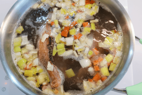 Bring to a boil and remove the foam. Monitor the broth: it should not boil. Cook for about 90 minutes.