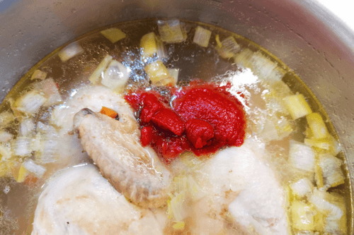 Add tomato paste to the broth.