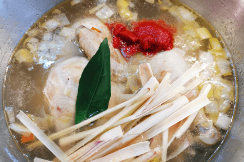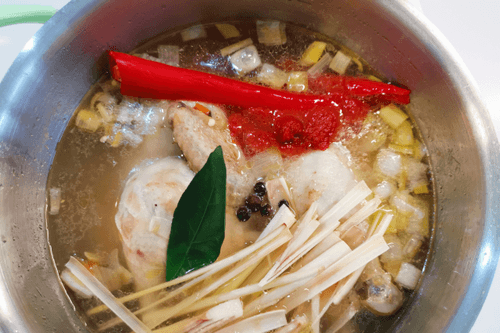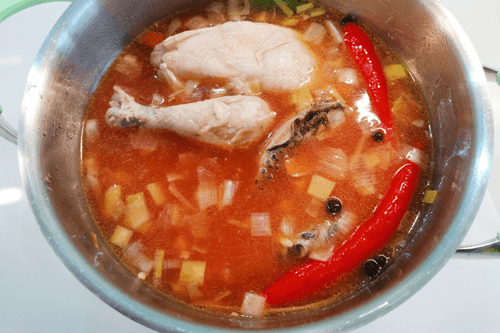 Eastern dark chicken broth is a fragrant creation of Pan-Asian cuisine, blending the rich flavor of roasted chicken with exotic spice notes. Its roots trace back to the traditions of Asian cooks aiming to create a harmony of flavors and the healing properties of broths. The light sweetness of carrots, the spiciness of ginger and garlic, and the freshness of lemongrass and lime make this broth both warming and refreshing. Seasoned with aromatic black pepper and fiery chili, it gains a spicy depth that perfectly complements its delicate base. This broth can be enjoyed as a standalone dish or used as a base for soups and noodles. It warms you up, fills you with energy, and creates a gastronomic journey into the heart of Eastern flavor traditions.