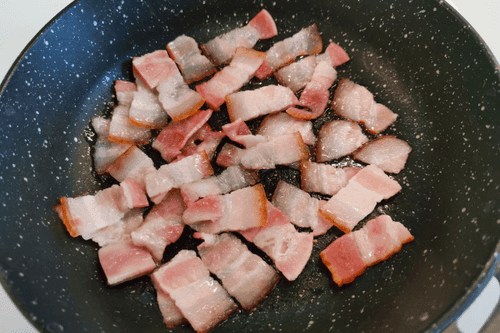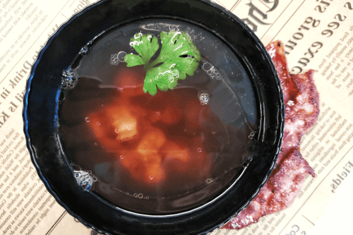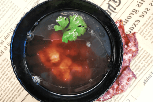 Strain the prepared broth, season to taste. Add bacon and serve.