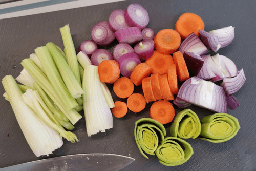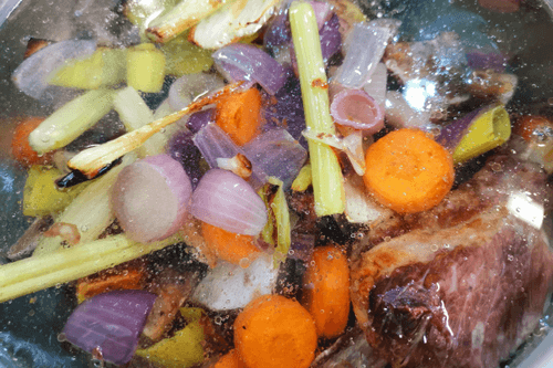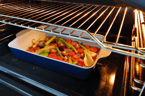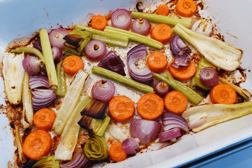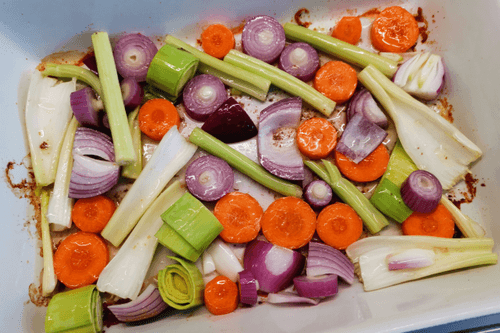 Place the vegetables in a baking dish with melted beef fat. Mix well.