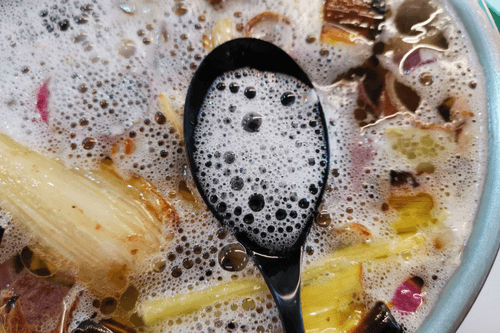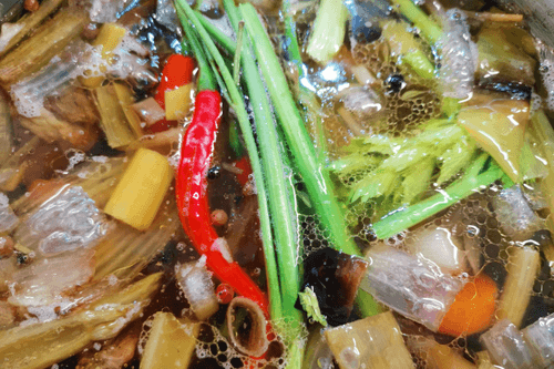Bring to a boil and remove the foam. Reduce the heat and ensure the broth does not boil.