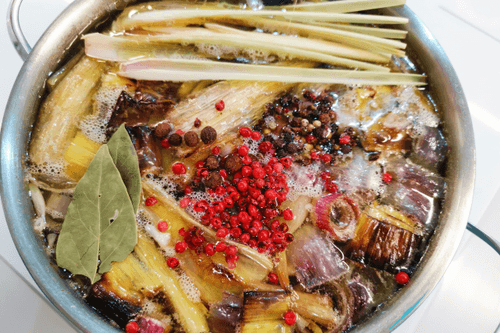 After 1 hour, add lemongrass, peppercorns, and bay leaf. Cook for another 3 hours.