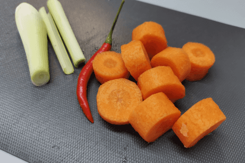 Chop the carrot coarsely. Prepare lemongrass and chili.