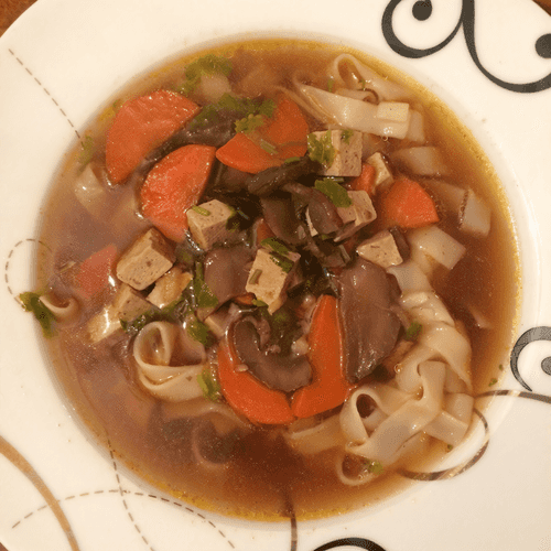 Add ginger, cilantro, chili pepper, and tofu with soy sauce marinade to the broth. Let it simmer on low heat for about 10 minutes.
