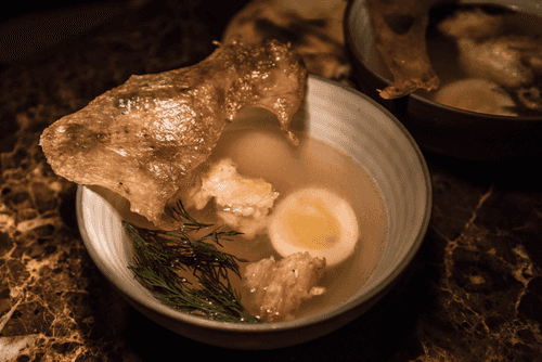 While the broth is boiling, we make chips. We spread the skin on a baking sheet, salt it, and cook under pressure in the oven at 150°C for 20 minutes.
