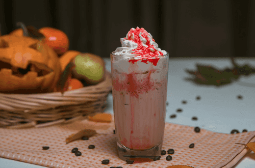 The 'Bloody Frappuccino' coffee is a bold and mysterious signature drink inspired by a passion for experimentation and gothic aesthetics. Its rich flavor is a blend of strong doppio espresso, gentle milk, and sweet chocolate syrup whipped with icy freshness. The presentation features blood-red drops of cherry or pomegranate syrup cascading down the glasses, creating the effect of a mysterious potion. The composition is completed by airy sweet cream that softens the rich, deep flavor of the coffee. This drink not only awakens the senses but also becomes an ideal choice for atmospheric evenings, themed parties, or simply for those who want to add a bit of intrigue to their coffee ritual.