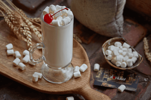 Pour the drink into a heat-resistant glass and garnish with marshmallows.