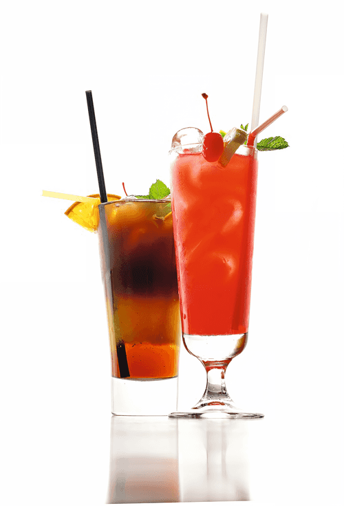 Pour in layers into a glass with ice: syrup, rum, orange juice, espresso.