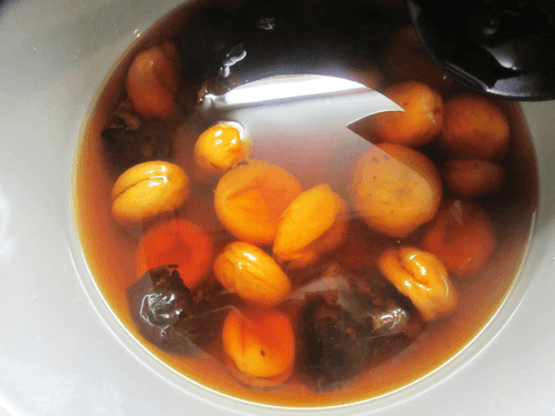 Pour sugar into a pot, add 3 cups of hot water, add prunes, and boil for 15 minutes on low heat. Then add apricots and raisins and boil for another 5 minutes.