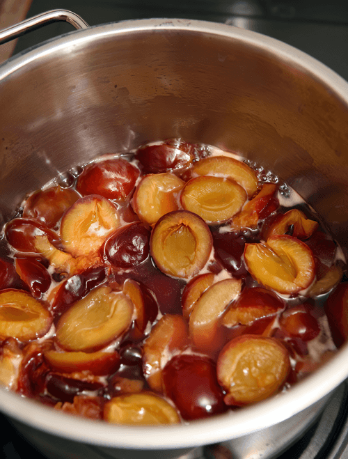 Add washed and pitted plums to the boiling compote, bring to a boil again, and cool.