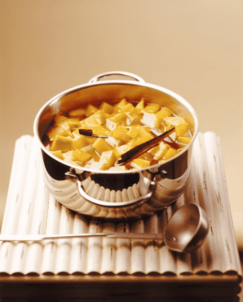 Place the cooled apples and mandarin slices in bowls and pour syrup over them.