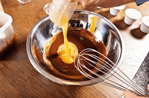 Using a pastry cone (which can be made from oiled paper or a bag), fill the cups with chocolate batter about halfway. Then, place the cups in an oven preheated to 180 degrees for three to four minutes.