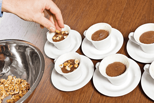 Chop the roasted hazelnuts. Once the cake is ready, take the cups out of the oven and sprinkle with crushed roasted nuts. Whip the cold cream with a whisk until fluffy, add the remaining sugar (30 g) and coffee extract, and whip again. The result is called Chantilly cream.