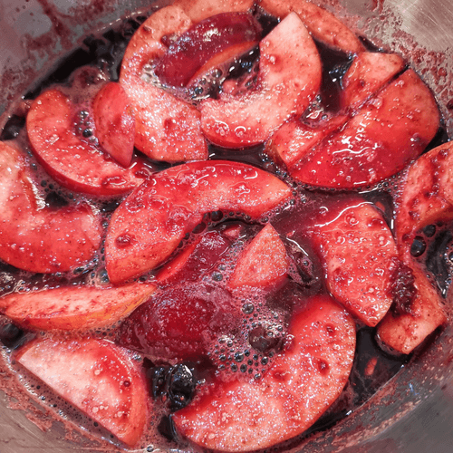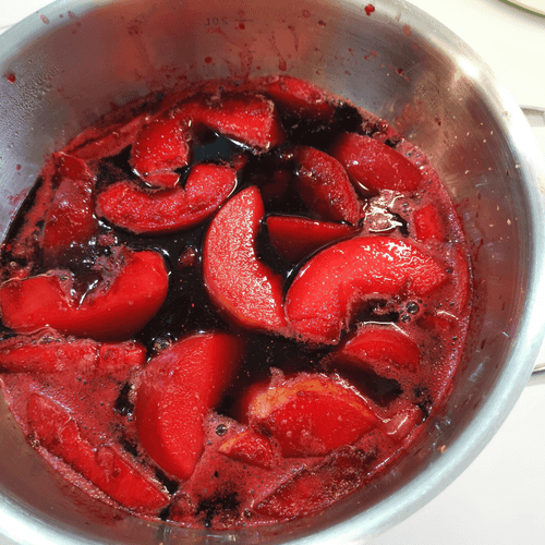 Once the wine starts to simmer, add sliced apples.