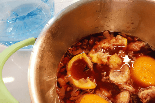 Squeeze orange juice into a pot and add the peels. Pour in water.