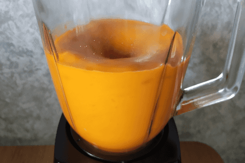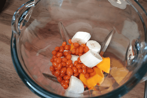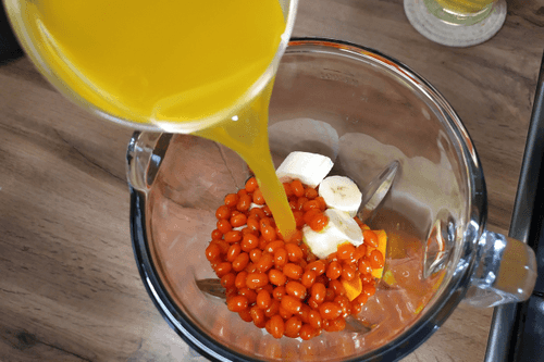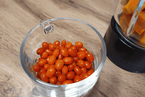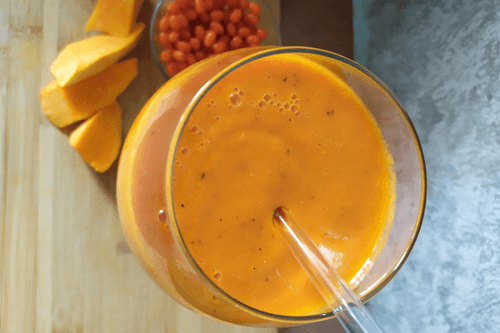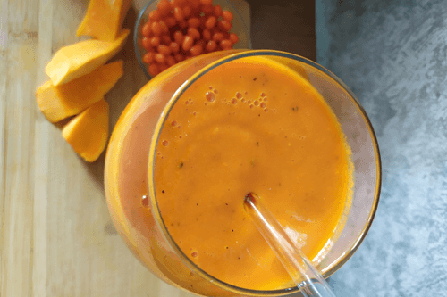 Pumpkin-sea buckthorn smoothie is a bright and healthy combination of flavors that captivates with its tenderness and richness. This drink was born from the desire to combine the autumn warmth of pumpkin with the refreshing tartness of sea buckthorn. Pumpkin gives the smoothie a velvety texture and light sweetness, while sea buckthorn enriches it with natural vitamins and invigorating taste. Banana adds softness, and orange juice brings citrus freshness, making the drink perfectly balanced. Cinnamon completes the composition with spicy notes. This smoothie is suitable for both a morning energy boost and a relaxing evening enjoyment. It can be served in a tall glass, garnished with sea buckthorn berries or mint, creating an atmosphere of comfort and coziness.