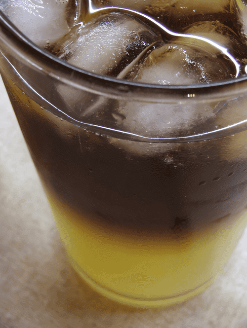 Thus, a two-layer cocktail will be created: an orange layer of freshly squeezed tangerine juice and a black layer of black vodka.