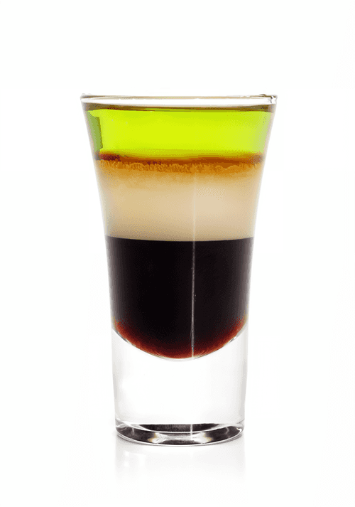 In a shot glass, carefully layer caramel syrup, then coffee, and top with absinthe.
