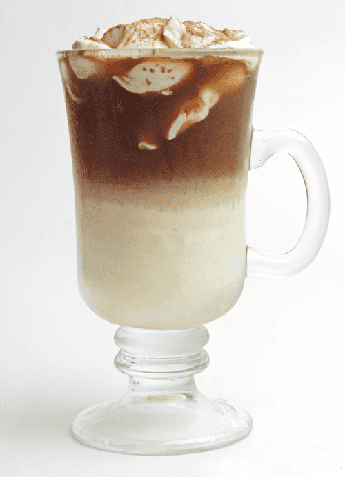 Add hot coffee and pour it into tall glasses. Top with whipped cream.