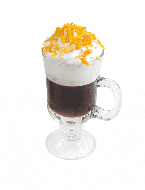 This delightful French coffee drink combines the rich aroma of freshly brewed coffee with the refined taste of Grand Marnier liqueur, known for its bright citrus notes. Cream whipped with orange zest adds tenderness and lightness, creating a harmony of flavors and textures. The drink is perfect for leisurely morning enjoyment or a cozy evening, filling the moment with warmth and elegance. Its roots lie in the traditions of French cuisine, where sophistication and attention to detail make each sip special. Served in a glass adorned with orange stripes, it becomes not only a gastronomic pleasure but also an aesthetic delight, revealing the beauty of French culinary art.