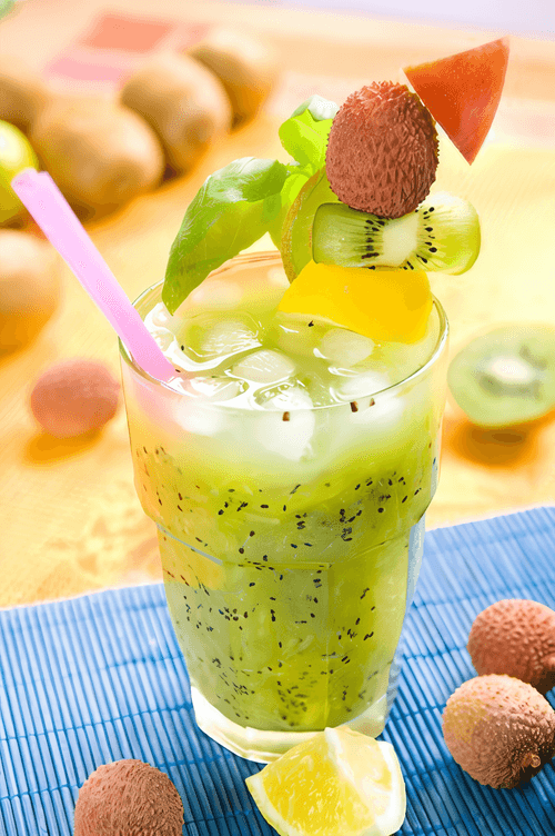 Decorate the rim of the glass with slices of kiwi and starfruit.