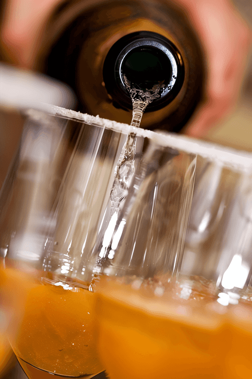 Pour champagne into a decanter and add the peach puree. Mix, pour into glasses, garnish with slices of the remaining peach, and serve immediately.