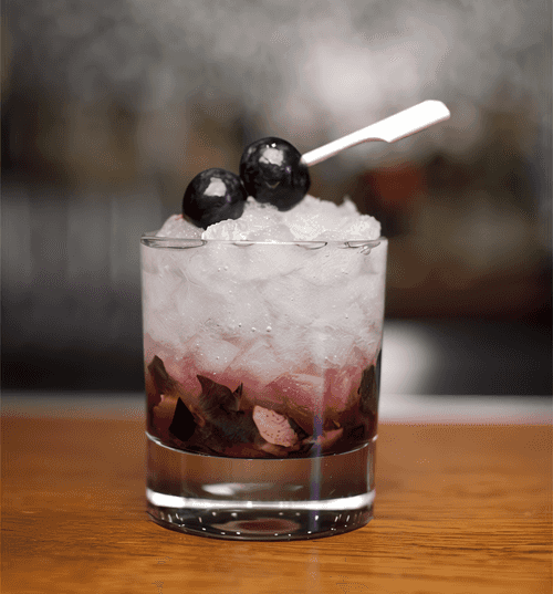 Muddle grapes and fresh ginger in a special glass (rock glass).