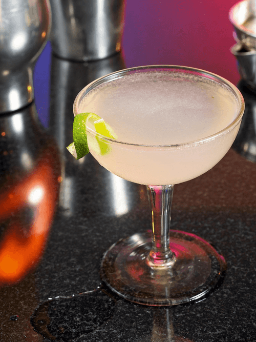 Pour the daiquiri (without ice) into a chilled martini glass and garnish with a twist of citrus peel — for this, wrap a cut strip around the cocktail straw and secure it in a spiral shape.