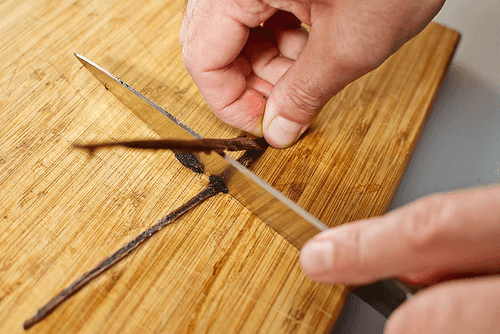 Cut the Madagascar vanilla pod lengthwise with a sharp knife and scrape out the insides — the small black seeds.