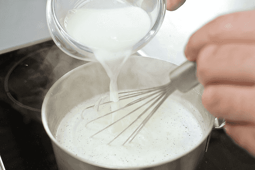 Pour the remaining milk into a small saucepan, add the vanilla pod with seeds, bring to a boil, then reduce the heat, remove the pod and slowly pour in the starch diluted in milk.