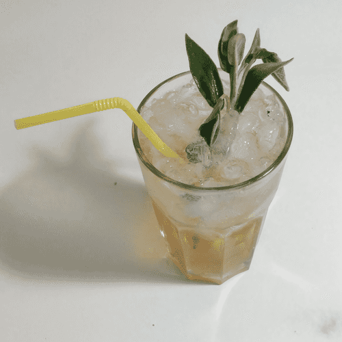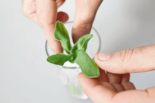 Place a quarter of lime, sliced, in a tall narrow glass. Add sage leaves. Crush the ice: you can grind ice cubes in a food processor with sharp blades or wrap them in a kitchen towel and hit with a rolling pin or meat mallet.