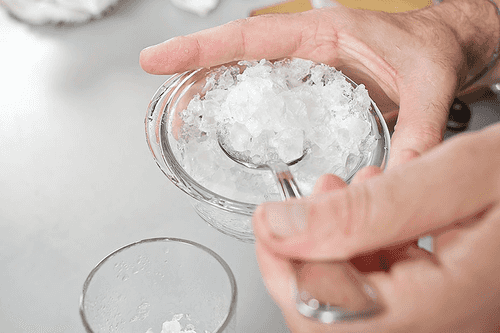Add a couple of spoons of crushed ice to the glass and muddle it. A muddler is a plastic or wooden bartender's pestle used to extract juice from fresh fruits, berries, or herbs directly in the glass. If you don't have one, a tablespoon can work.