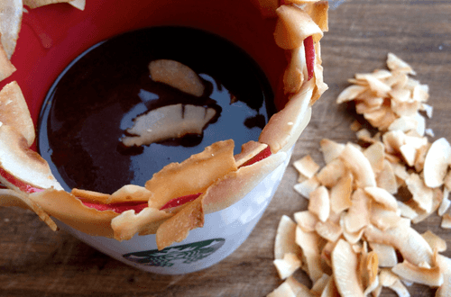 Take the mugs for serving hot chocolate and coat their edges with a little condensed milk. Lightly toast the coconut flakes in the oven at 200 degrees for 5 minutes until golden and use them to rim the mugs.