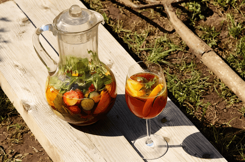 Put everything in a pitcher or, if preparing in portions, in a glass. Mix a little and crush the mint and fruits to release their juice.