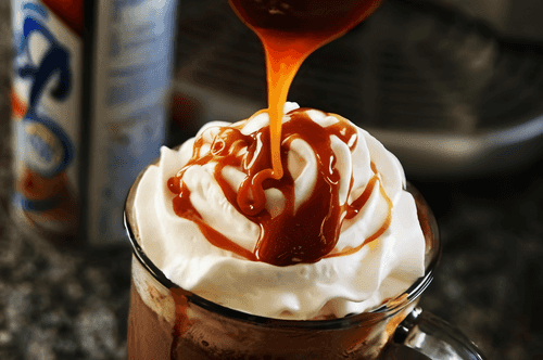 Top the hot chocolate with whipped cream and add the leftover caramel syrup on the cream.