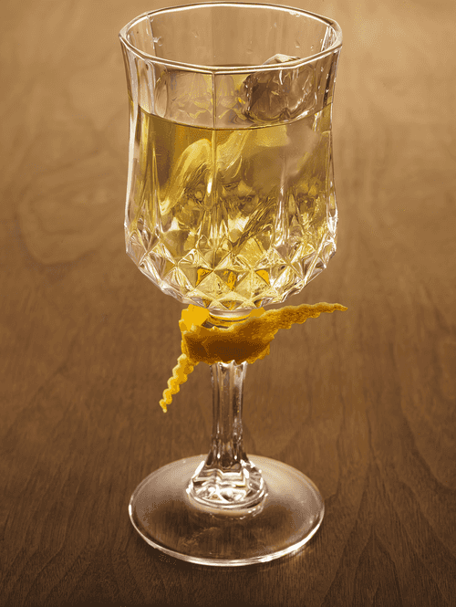 Strain into a cocktail glass with ice. Garnish the stem with a knot of lemon peel.