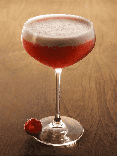 Muddle four raspberries in a shaker, add gin and lemon juice, then add egg white. Shake. Add ice cubes and shake again.