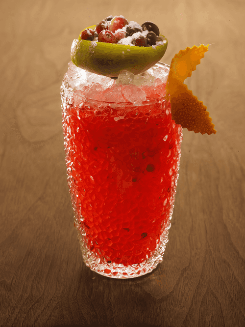 In a mixing glass, add three large handfuls of cranberries (reserve a few berries for serving) and pour in the syrup, then muddle thoroughly to release all the juice from the cranberries.