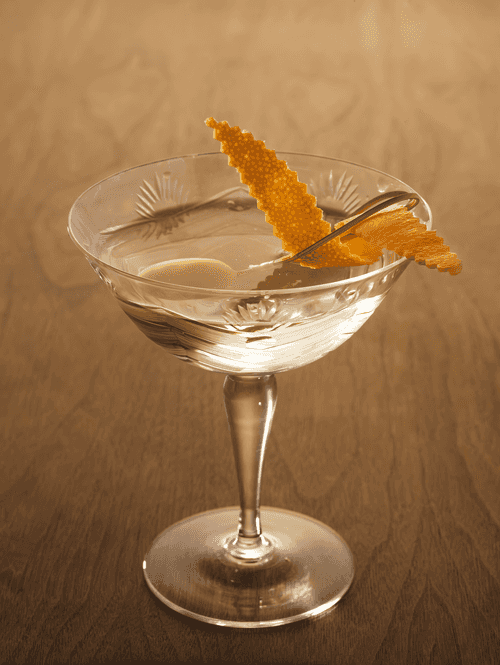 Pour the cocktail into a chilled serving glass, lightly squeeze the zest. Garnish with an olive and zest and serve.