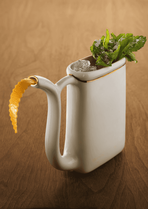 Fill a ceramic container (e.g., a teapot) with crushed ice, pour the cocktail into it. Garnish with mint, sprinkle with powdered sugar, and attach grapefruit zest to the spout. Drink through the spout.