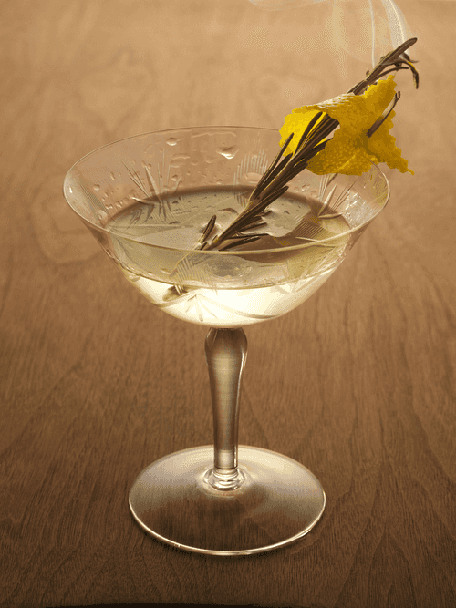 Spray the cocktail with lemon zest and run it along the rim of the glass. Garnish with zest and a sprig of rosemary: it should be set on fire before serving.