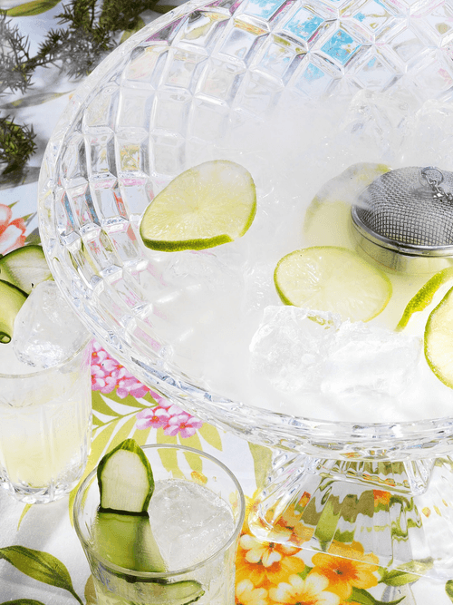 In the punch bowl with ice cubes, add sliced lime and cucumber (what's left). Strain the cocktail into it through a bar strainer.