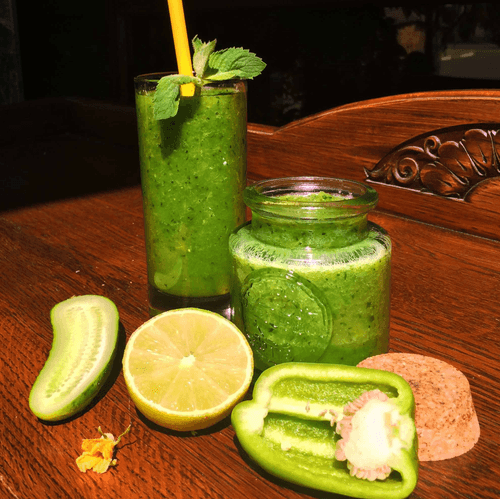 Green gazpacho, also known as 'Dacha smoothie', is a refreshing and light summer soup originating from Spanish cuisine. Unlike traditional red gazpacho, it is filled with green hues of freshness thanks to bell pepper, cucumber, apple, parsley, and mint. Apple juice and lime juice give it a mild tanginess while crushed ice makes it the perfect drink for hot days. The combination of fruit sweetness and subtle spiciness of greens creates a harmonious flavor that invigorates and refreshes. This gazpacho is suitable for a light snack or served as an original cold soup at a summer dinner. It not only delights the taste but is also a rich source of vitamins, making it an excellent choice for those seeking healthy eating.