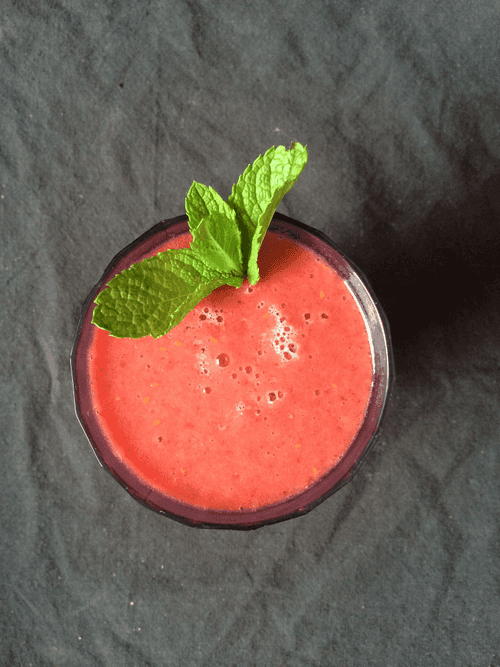In a blender, blend raspberries, pineapple, rice milk (can be replaced with regular milk), and mint leaves. If you have time and desire, you can blend the raspberries separately and strain them through a sieve to remove the seeds. This is what all professional chefs do.